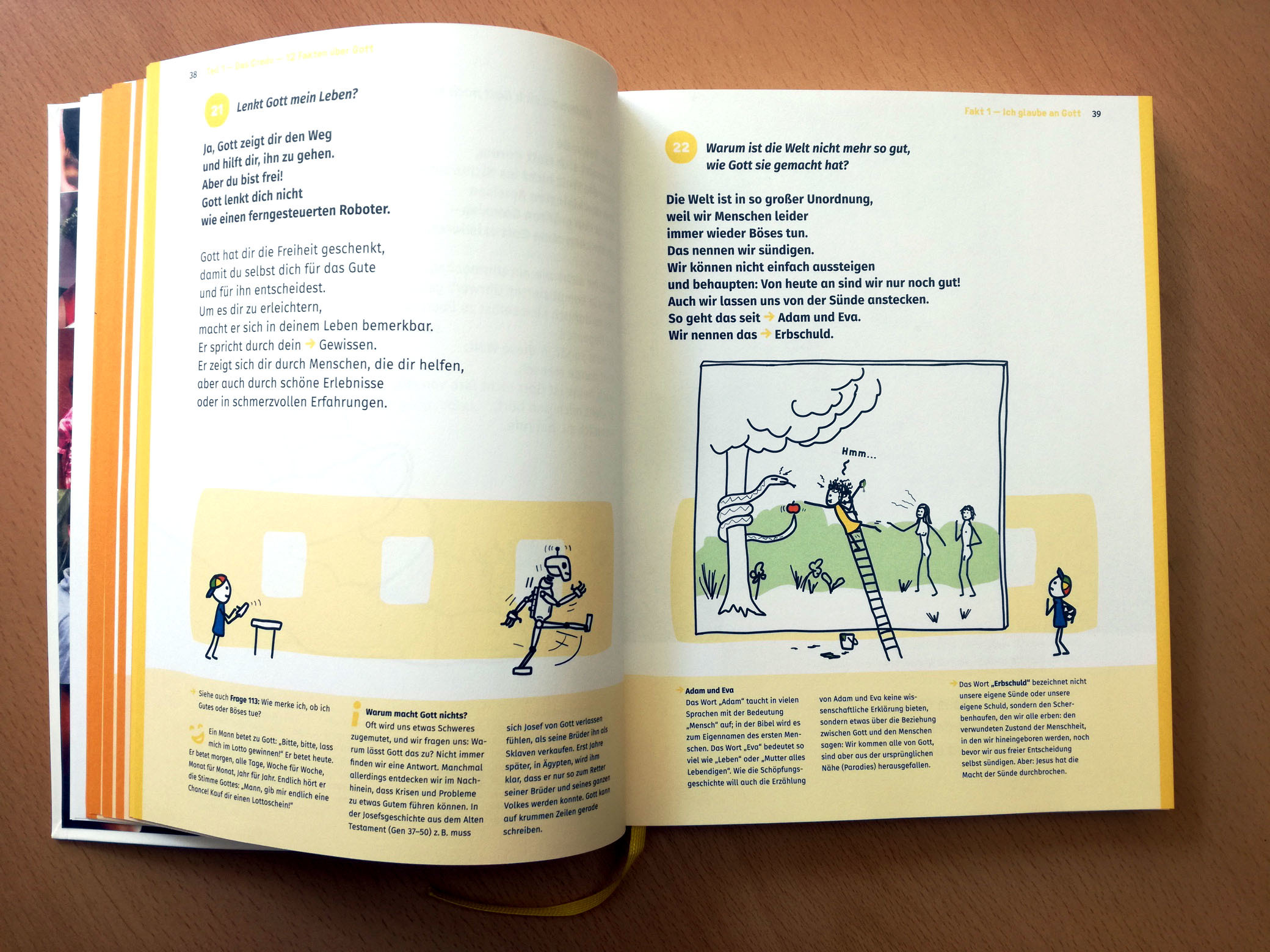 Herausgekommen ist ein bunt illustriertes Buch für Kinder und ihre Eltern, mit dem sie Schritt für Schritt den christlichen Glauben tiefer kennen lernen können. Ausgegangen wird dabei von einfachen und gleichzeitig großen Fragen Fragen vieler Kinder wie "Warum gibt es mich?", "Woher wissen wir, dass es Gott gibt?" oder auch "Was passiert mit mir, wenn ich mal tot bin?" und "Wie ist es im Himmel?" Auf Basis ähnlicher Fragen werden etwa auch die Sakramente sowie die Zehn Gebote erklärt oder beantwortet, was ein Papst ist.