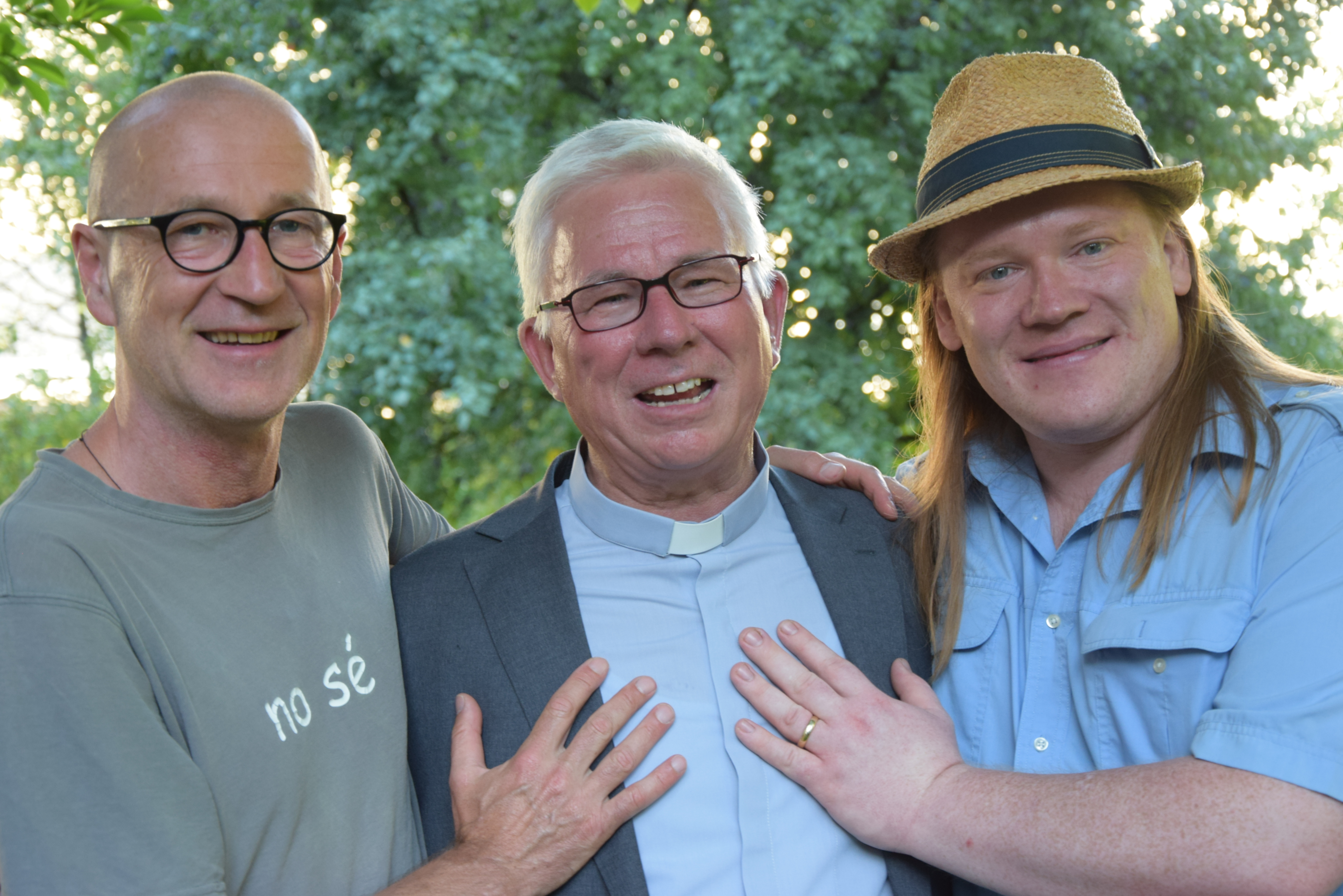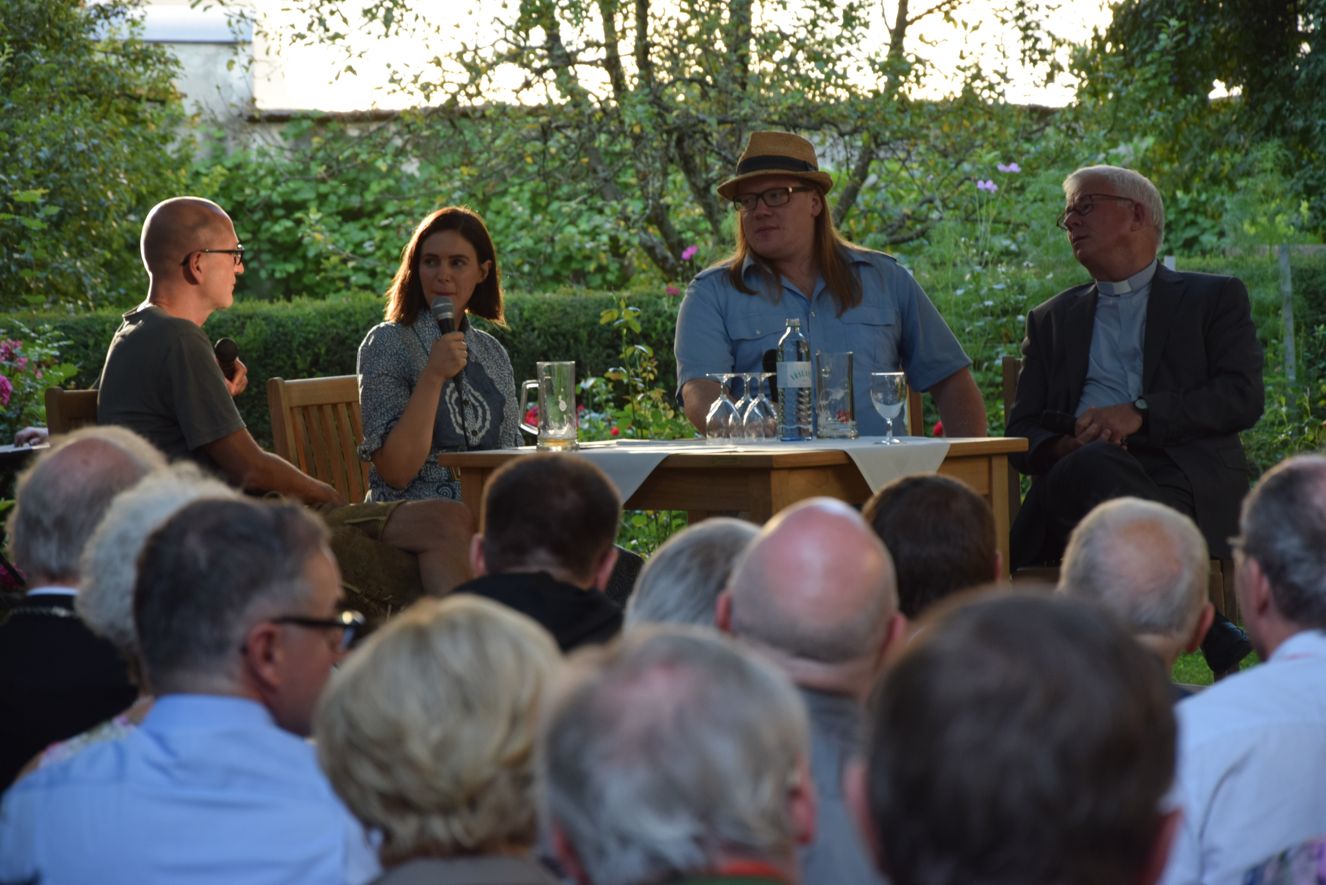 v.l.: Peter Lohmeyer (Darsteller "Tod" im Jedermann), Erzbischof Franz Lackner, Christoph Franken (Darsteller "Teufel" im Jedermann) - Gespräch im Bischofsgarten im Rahmen der "Salzburger Hochschulwochen" am 4. August 2016.